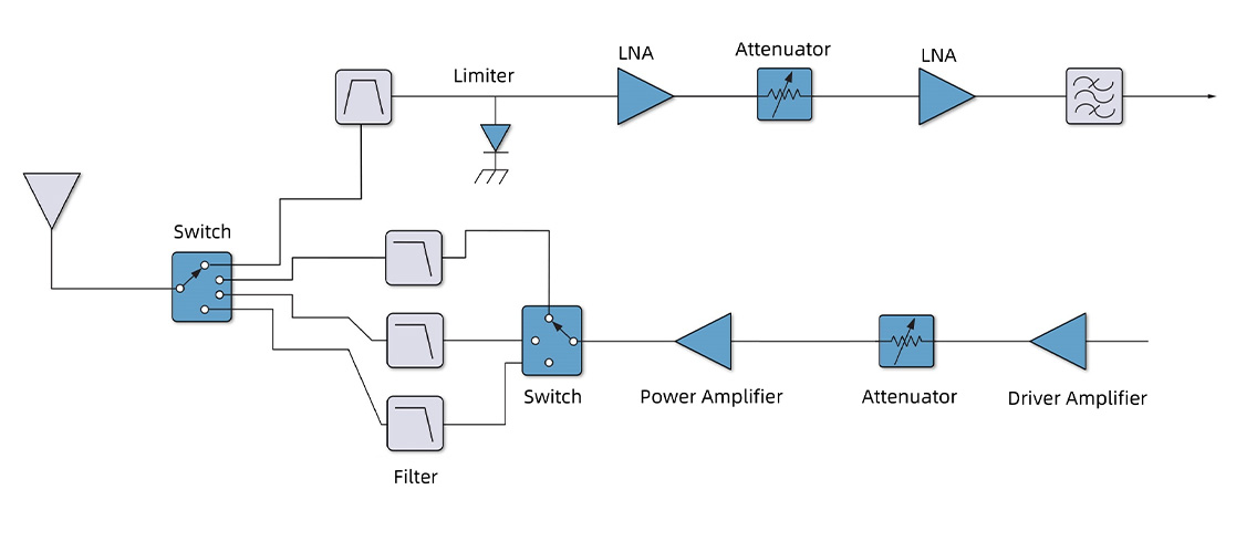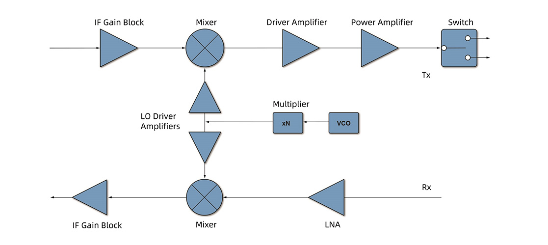 RW MMIC provide complete chipset designs for transceiver links of typical applications, including active and passive MMICs based on GaAs, GaN, or Si technology. For example: mobile radio, radar, satcom, etc.